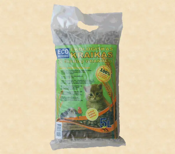Iš šiaudų granulių pagamintas kraikas supakuotas į patogią 5 litrų PVC pakuotę.